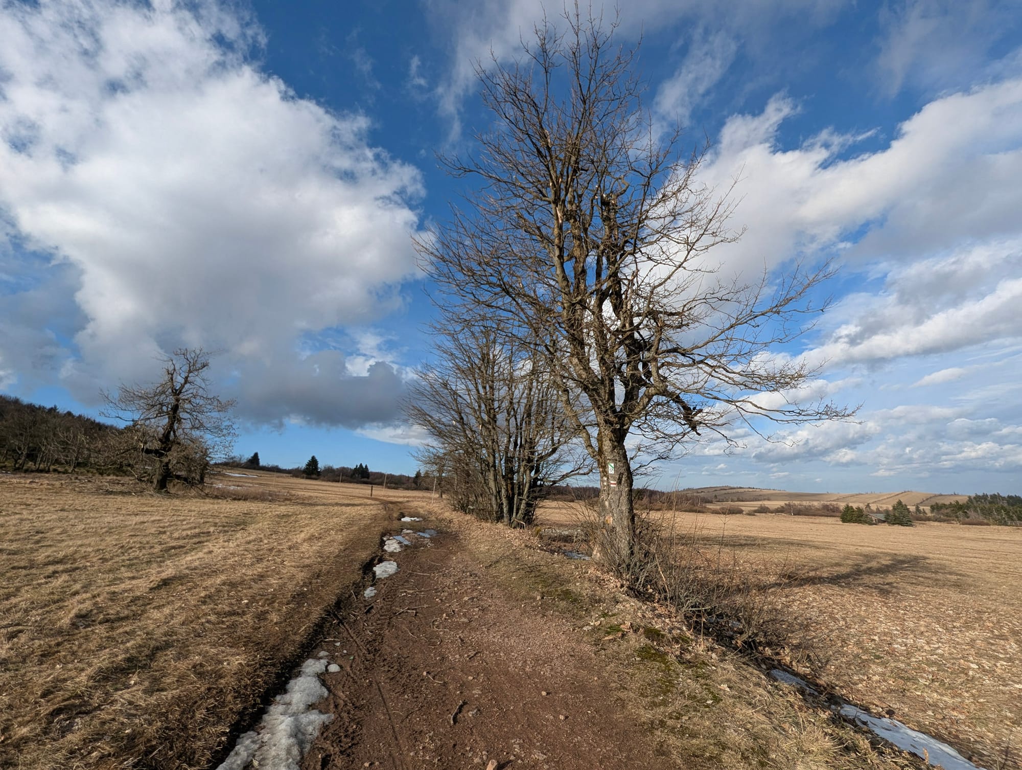 Die Landschaft des Osterzgebirges wirkt vielleicht grad zwischen Nichtmehrwinter und Nochnichtfrühling besonders beeindruckend. Wenn über die sonnengefluteten Hochebenen der Wind mächtige Wolkengebilde treibt und ansonsten alles still liegt - nur ab und an ein Vogelzilp oder ein Krähenruf - dann fühlst du beim Wandern über die kargen Flächen mit ihren windschiefen Bäumen vielleicht genauso wie wir, dass sich ein ordentliches Maß Ruhe und Gelassenheit in dir breitmacht.