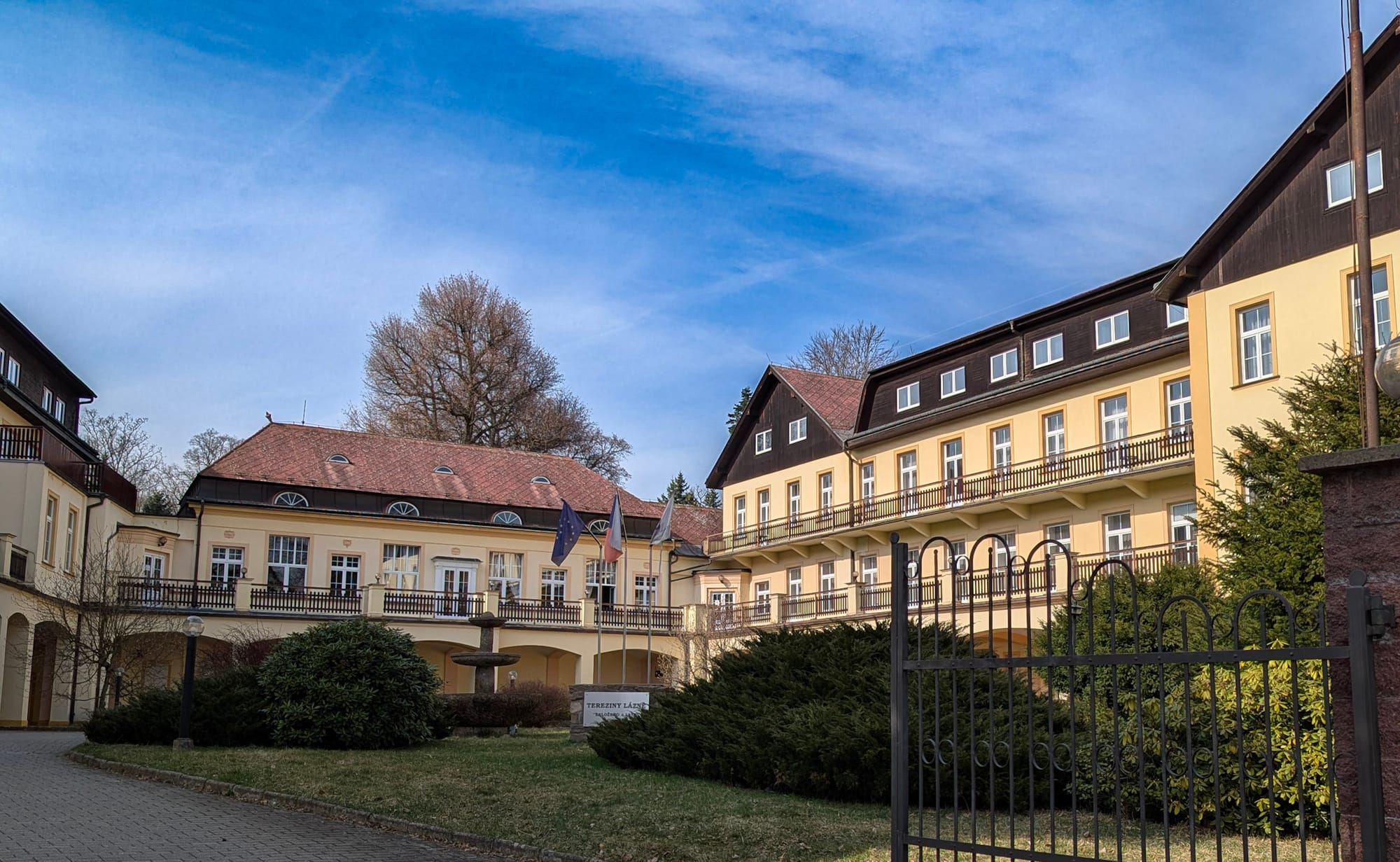 Entspannen in Dubí - heutzutage stehen da vor allem Knie und Physio im Vordergrund. Die Kurklinik Tereziny lázně liegt ein kurzes Stück weg von der Hauptstraße in der Lázeňská 21, gleich hinter dem Hotel "Golf", das jetzt (im Frühjahr '26) offenbar renoviert werden soll. Seit 1870 existiert die Klinik schon.