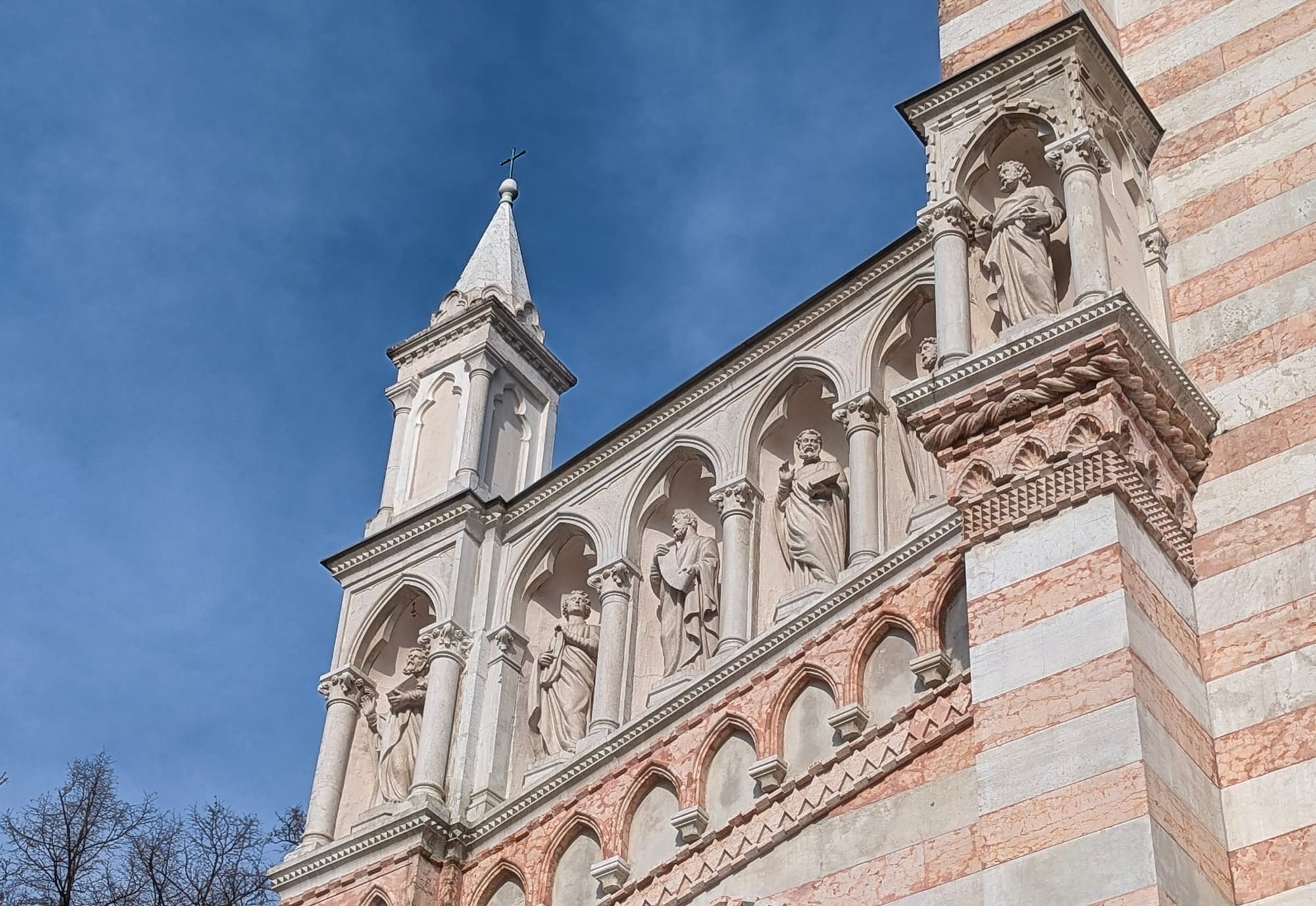 Der Glockenturm ist 33 Meter hoch, und links und rechts über dem Eingangsportal wachen die zwölf Apostel über den Gang der Dinge. An der Südseite beeindruckt ein aus Venedig stammendes verziertes Portal.