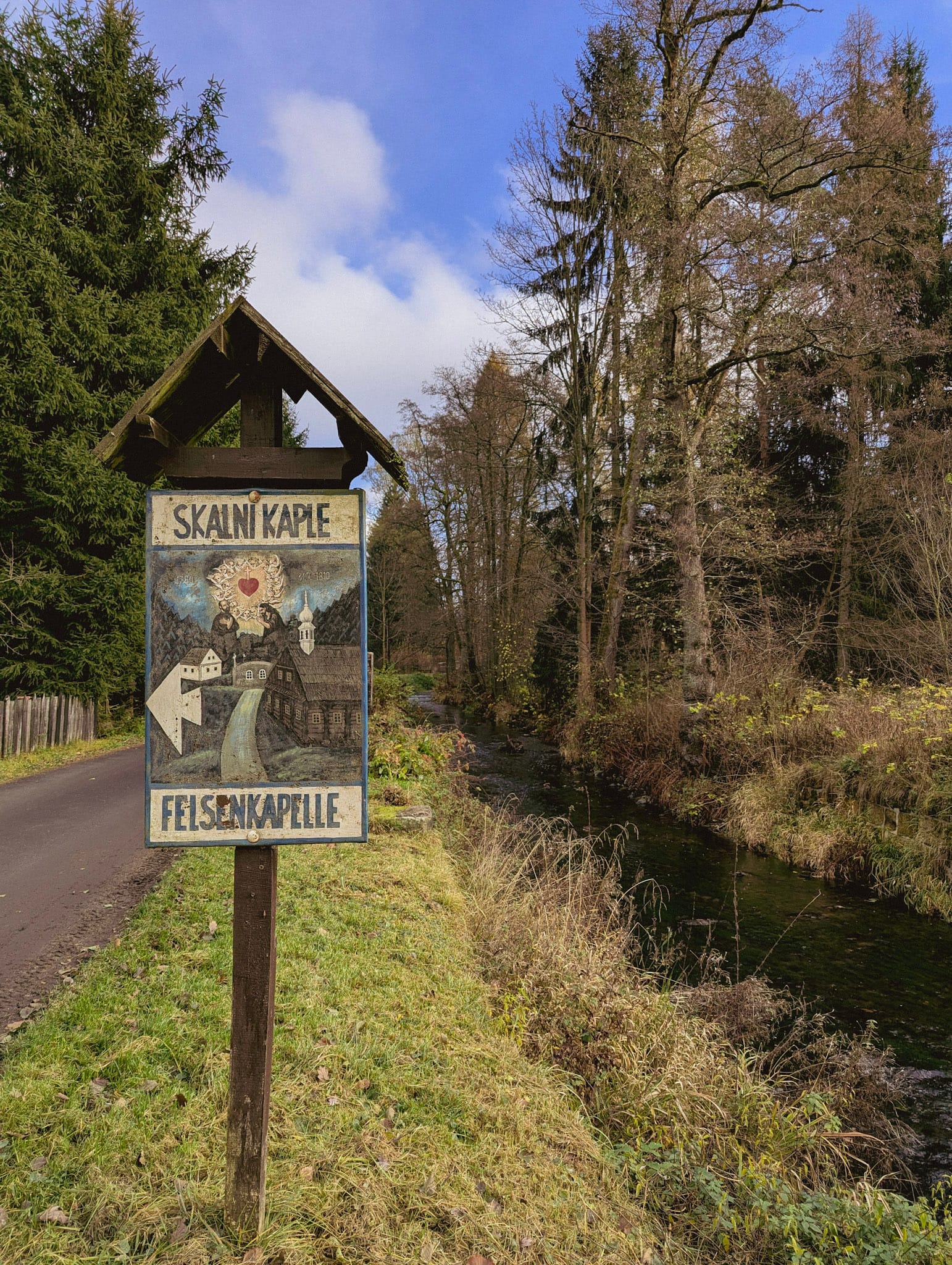 Zu ihr gelangst du, wenn du - aus Richtung Srbská kommend - eine kleine Brücke über den Fluss nimmst. Rechterhand liegt die einstige Schule von Schemmel, ein schwarz vertäfeltes Haus mit kleinem Türmchen. Wenige Meter dahinter schmiegt sich die Kapelle an den ansteigenden Berg.