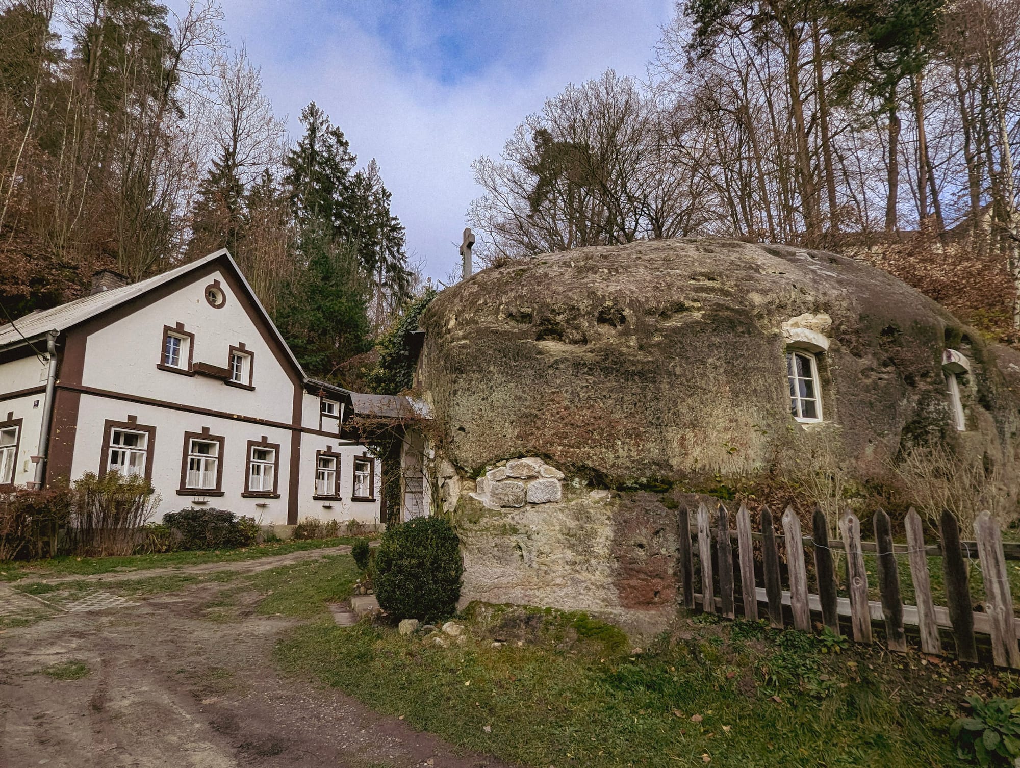 Einmal in Srbská, lohnt unbedingt auch der Weg in das Dörfchen Schemmel, heute Všemily. Hier siehst du ebenfalls Umgebindehäuser - und die bemerkenswerte Felsenkapelle St. Ignatius! Sie ist aus einem Sandsteinblock herausgearbeitet worden und wirkt, als wäre sie einem Buch von Tolkien entnommen.